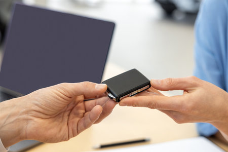 Male hand giving car key to female hand She is holding a cell phone In the background, a fragment of the car