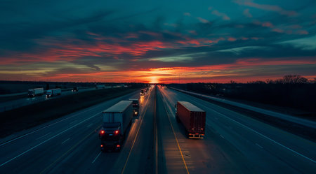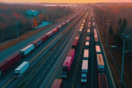 drone shot of cargo trucks on highway in a row, created with generative ai