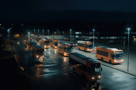 bus depot in the evening, with buses parked and lights off, created with generative ai