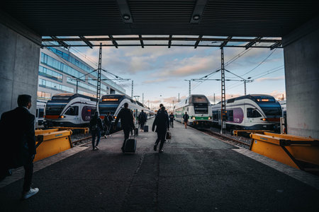 A stunning view of modern trains lined up in a vibrant railway station showcasing intricate architecture and dramatic lighting, emphasizing the heartbeat of urban transportation.