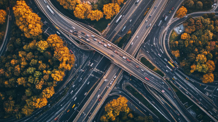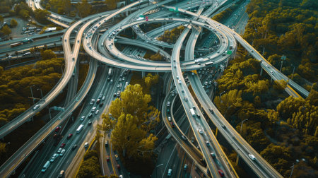 Aerial panorama of intricate highway overpass network with bustling traffic