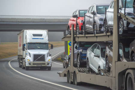 08.03.2019. Russia, Krasnodar. View from the car window. A truck carrying new cars pulled into a gas station.