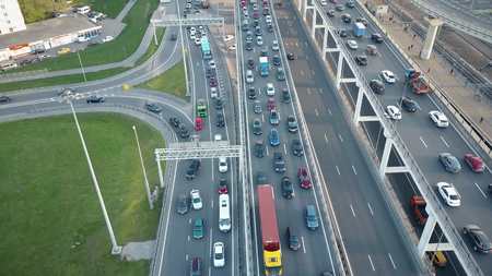 MOSCOW, RUSSIA - MAY, 22, 2017. Aerial shot of traffic jams on the car roads in the rush hour