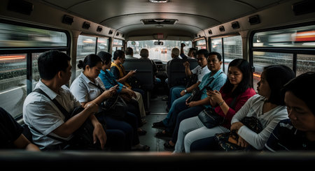 The interior view from the back of a public bus or van in a Southeast Asian city at night. Passengers are seated, some looking at their phones, while the city lights outside are blurred with motion, conveying the feeling of a daily commute and urban life.
