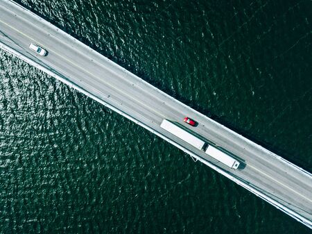 Aerial top view of bridge road with cars over lake or sea in Finland