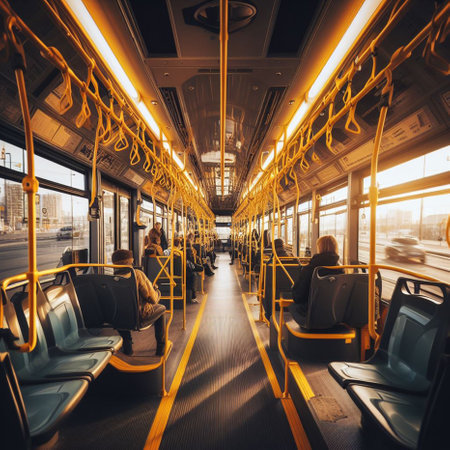 Empty bus interior with yellow seats and lights. Trains in the city.