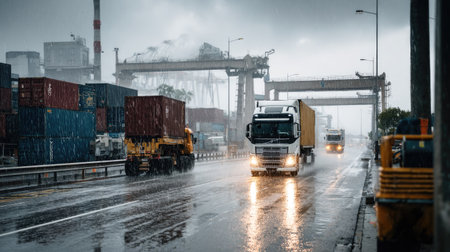 A busy shipping port scene captures trucks maneuvering through rain on a wet road, surrounded by towering cranes and colorful containers.