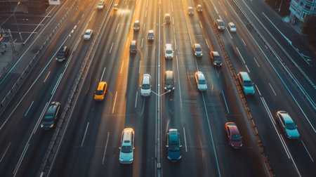 Aerial view of a highway with vehicles moving smoothly during rush hour traffic.