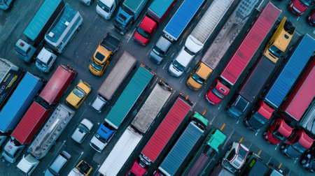 commercial fleet-semi trucks and delivery vans neatly parked in rows, illustrating the efficiency of a well-managed supply chain