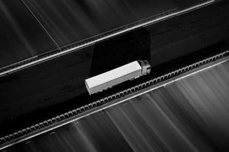 Bridge with two lanes and subway or train rails on a background of dark water. Aerial view