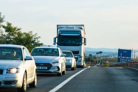 Highway A1, near Vransko, Slovenia - 29 August 2018 - Cars standing still in lines on highway, a car accident caused traffic jam on the busiest highway in Slovenia between Maribor and Ljubljana