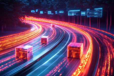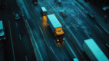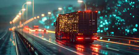 A vibrant aerial view of a busy highway showcasing a prominently featured truck, illuminated by city lights, intertwined with digital network elements.