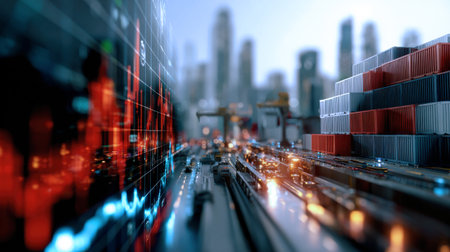 Cargo transport lines connecting different logistics zones in a cityscape background