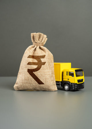 Delivery truck and Indian rupee money bag. Profit and taxes from cargo transportation. Growth in freight traffic, revenues and fees. Economic development. Increased prices.
