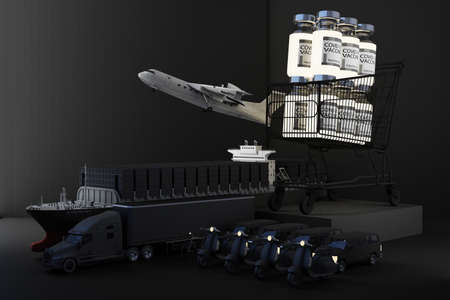 3d illustration, boxes in a warehouse and vehicles dedicated to transport