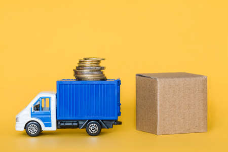 The concept of saving money. Cargo transportation, delivery service. Transport company. Infrastructure and logistics. Unloading cardboard box. Place for text