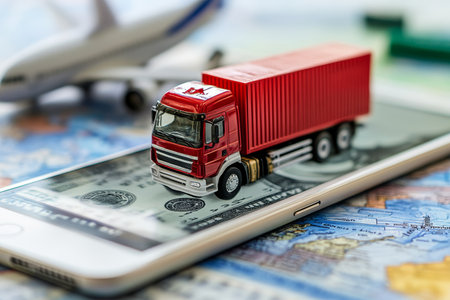 A hand delicately holds a miniature truck model over an abstract map, symbolizing logistics and global transport planning, ideal for travel and delivery themes.