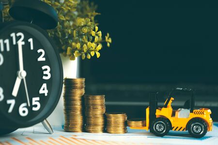Miniature mini forklift truck with coin stack on working table with office supplies or office work essential tools items for business financial concept