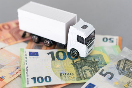 white toy truck on euro banknotes. concept for logistics, transportation and and finance. High quality photo