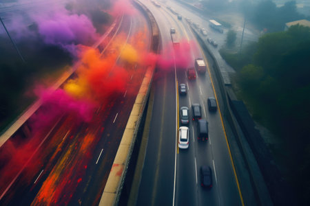 A captivating aerial view showcasing a busy city highway filled with vehicles, surrounded by a vibrant urban landscape and modern skyline under a cloudy sky.
