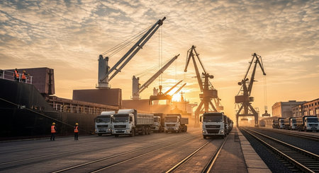 The dock comes alive at dusk with a vibrant mix of shipping containers and illuminated cranes working against a twilight backdrop. Generative AI.