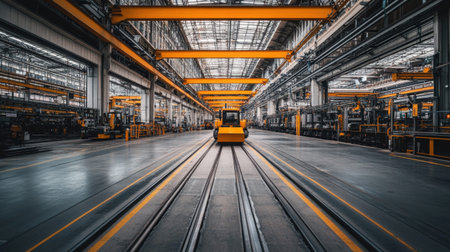 A wide-angle view of an industrial warehouse showcasing heavy machinery on cargo tracks, highlighting the modern design and technology utilized in manufacturing and logistics.