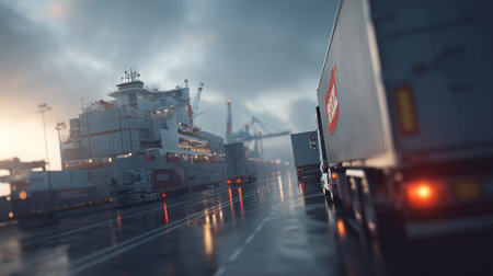 Modern Semi-Truck Cargo Transportation with Sunset at Port for Global Commerce