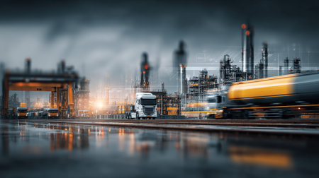Captivating industrial scene featuring trucks and trains in motion at a bustling refinery, illuminated by soft lights under dramatic evening skies.