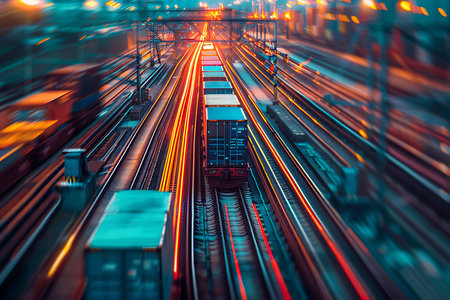 This aerial photograph captures the intricate layout of a bustling industrial railroad yard at night, showcasing freight trains and illuminated tracks in an urban environment.