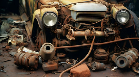 A close-up shot of a rusted car engine, showcasing its intricate details against a blurred background of other salvaged parts. --ar 3:2 --v 6 Job ID: 8ead3859-ee8e-49ce-8c47-8c1847938475