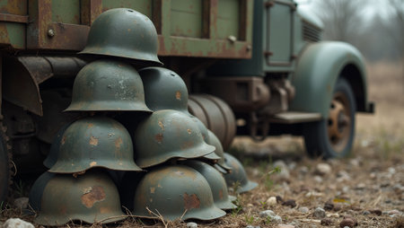 Pile of battered military helmets by old truck remnants of forgotten wars