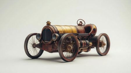 A meticulously crafted vintage race car model made of wood and metal is displayed against a neutral backdrop. The vehicle features ornate details, showcasing vintage design elements and craftsmanship.