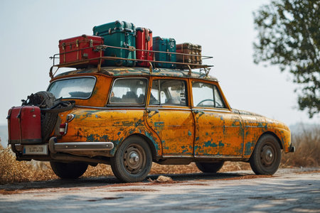 Old suitcase over the wheel, on the trunk of an old car for any purpose