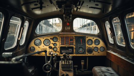 Weathered aircraft cockpit displays gauges, switches, and instruments