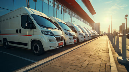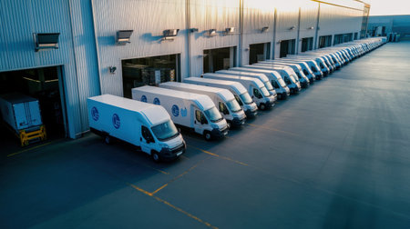 A fleet of delivery vans lined up outside a warehouse, preparing for distribution to various locations