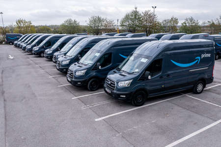 LEEDS, UK - APRIL 25, 2022. A fleet of Amazon Prime Ford Transit delivery vans ready to be loaded to deliver online shopping items to homes in the UK
