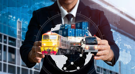 Businessman employing for logistic network distribution and smart transportation, truck and container cargo ship networking intelligent logistics, logistic import export, and industrial.