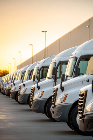 Fleet of White Semi Trucks Parked in a Row at Warehouse Loading Dock, Golden Hour Illumination.
