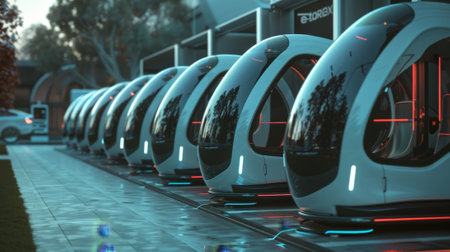 A fleet of electric buses in a modern automated depot, showcasing a future of ecofriendly public transportation and advanced urban mobility