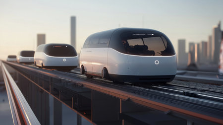 A collection of futuristic autonomous vehicles glide smoothly on an advanced rail system in an urban environment, symbolizing the future of transportation technology.