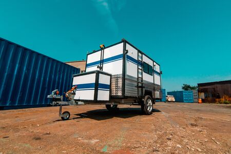Photo of white makeshift house on wheels taken from trailer