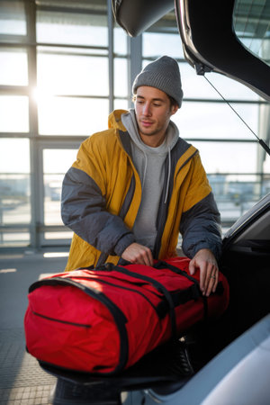 Young man is carefully placing a large red duffel bag into the trunk of his car at an airport parking lot, preparing for a journey