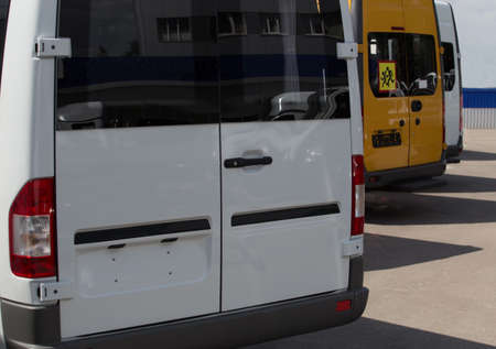 New minibus for sale in the parking lot. Dealer Buses