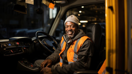 Smiling african american male driver driving a truck at night.