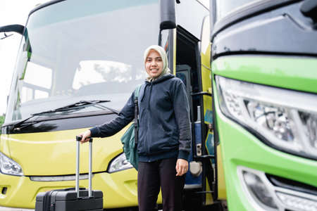 a woman in a veil smiles looking at the camera while holding a suitcase against the background of the bus before leaving