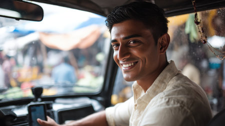 A young man in a cream shirt smiles while setting the GPS in his car. The bustling city market is visible through the windows, creating a vibrant urban backdrop.