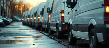 Row of white commercial delivery vans for transporting service company with copy space