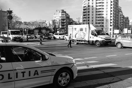 Car traffic, pollution, traffic jam city downtown Bucharest, Romania, 2022