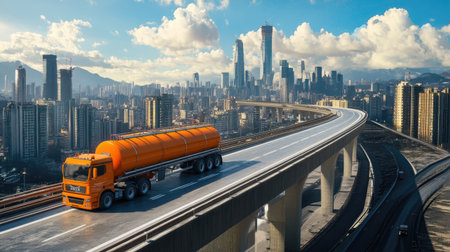 An orange truck navigates an elevated highway surrounded by a stunning urban skyline, showcasing modern architecture and vibrant city life under a clear sky.