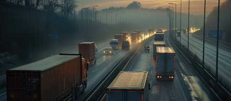 Traffic in the fog on the highway at sunset. Freight transportation.